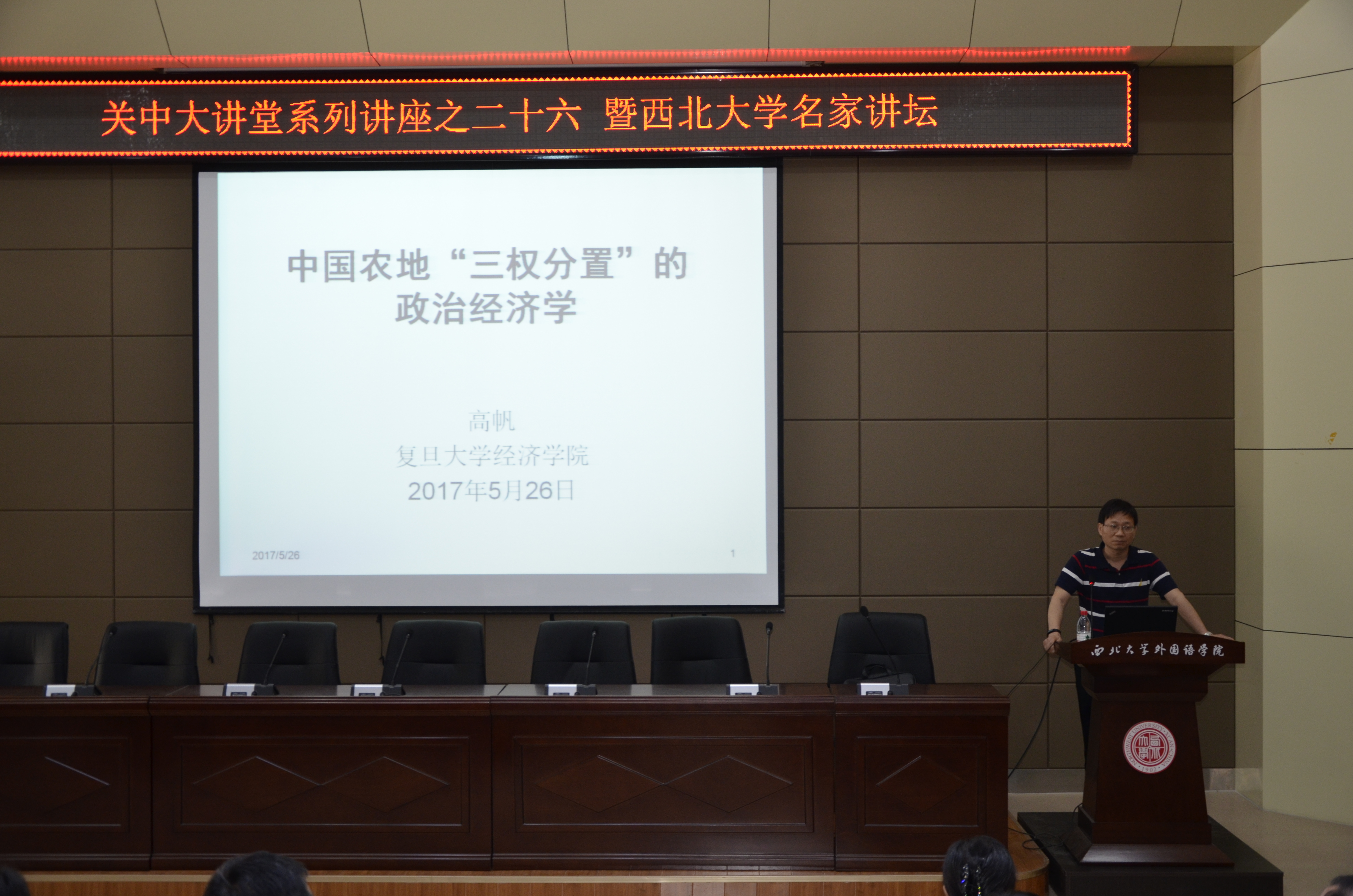 2017年5月26日,复旦大学经济学院经济学系常务副主任、博士生导师高帆教授访问我院,并在“关中大讲堂”系列讲座作题为《中国农地“三权分置”的政治经济学》的学术报告。此次活动也是西北大学名家讲坛系列活动之一。
