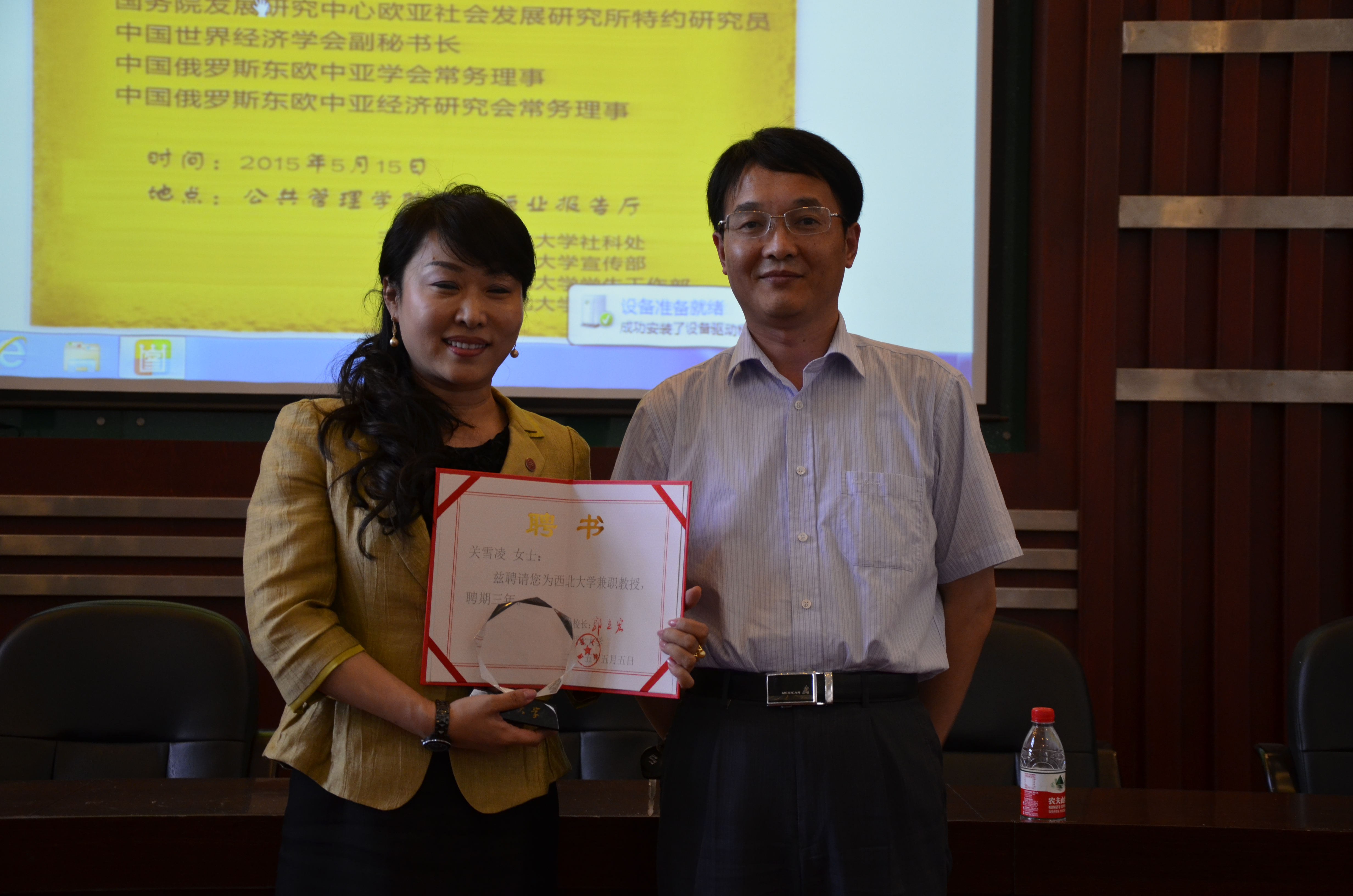 人事处张远军处长为关雪凌教授颁发西北大学兼职教授聘书