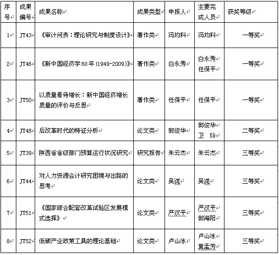 根据陕教技办(2011)17号文件,2011年度陕西高校人文社会科学研究优秀成果奖经过高校推荐、评审委员会专家的认真评选、以及公示,共评出获奖项目305项,其中一等奖34项,二等奖98项,三等奖173项。我院8项成果获奖(全校41项),其中一等奖3项(全校8项),二等奖1项(全校15项),三等奖4项(全校18项)。名单如下: