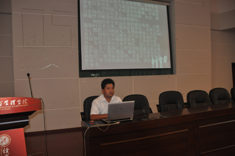 2011年8月31日上午,776net必赢官网新生入学教育第三场专题报告会在金海恒业报告厅举行。西北大学公安处刑侦治安科科长丁小刚老师应邀为我院新生进行安全知识教育专题报告。报告会由经管学院党委副书记樊涛主持,480余名新生参加了讲座。