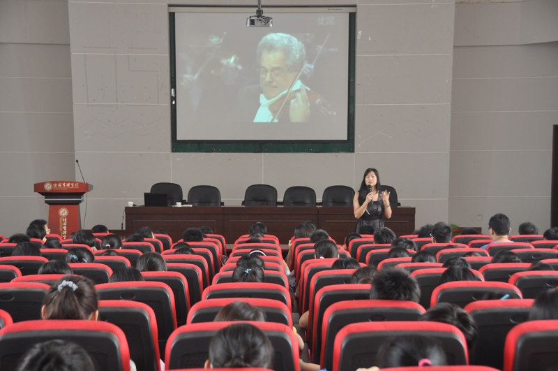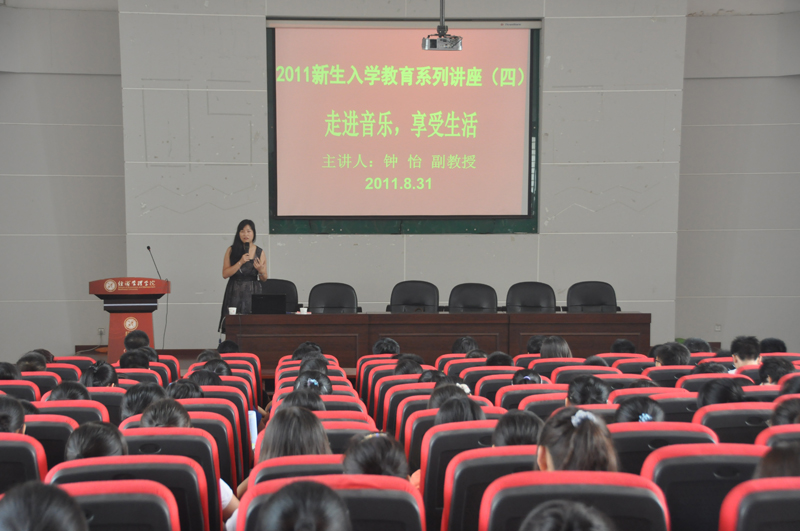 2011年8月31日下午,西安音乐学院管弦系小提琴教研室主任,西安音乐学院交响乐团首席钟怡副教授应邀在金海恒业报告厅为我院2011级新生做了题为“走进音乐,享受生活”的新生入学教育第四场专题讲座。讲座由经管学院团分委书记马金宝老师主持,共有260余名新生参加了讲座。