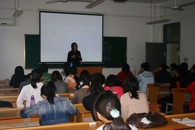 10月21日下午,我院07级企业管理专业潘颖博士在8213教室作了题为《上市公司并购与企业业绩关系的实证研究》的专题报告。报告会由院团委马金保老师主持,09级管理类硕士研究生参加了报告会。